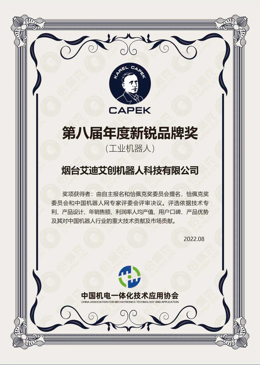 8月26日,被譽為機器人行業奧斯卡的“恰佩克獎”頒獎儀式在蕪湖舉行,艾迪艾創實力攬獲恰佩克獎項—— 第八屆年度新銳品牌獎(工業機器人)。該獎項既證明了艾迪艾創機器人強大的產品與技術實力,也是對艾迪艾創機器人品牌的高度肯定。
