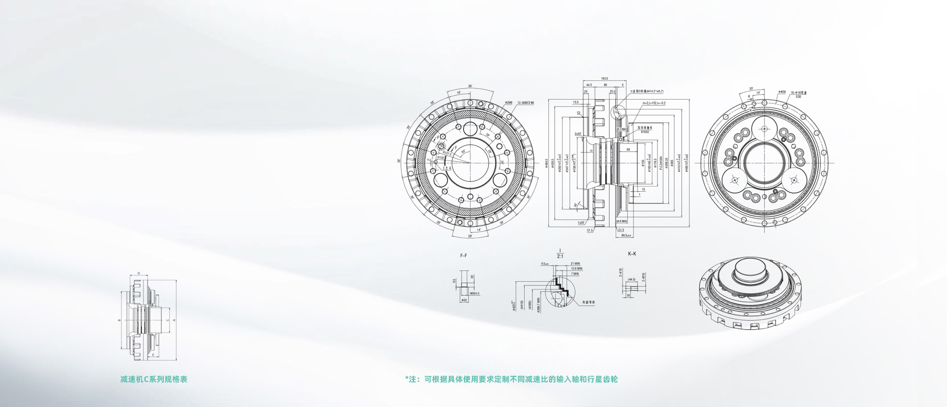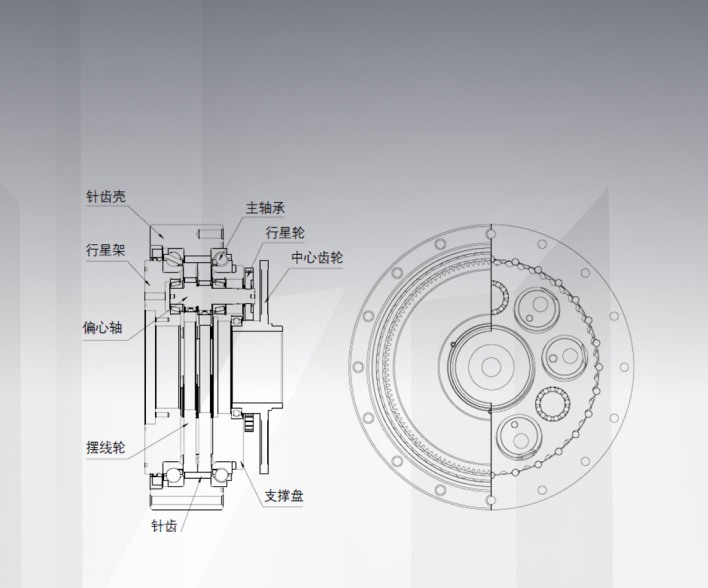 減速器安裝有角接觸球軸承支撐外部載荷,彎矩剛性強(qiáng)、容許力矩大。